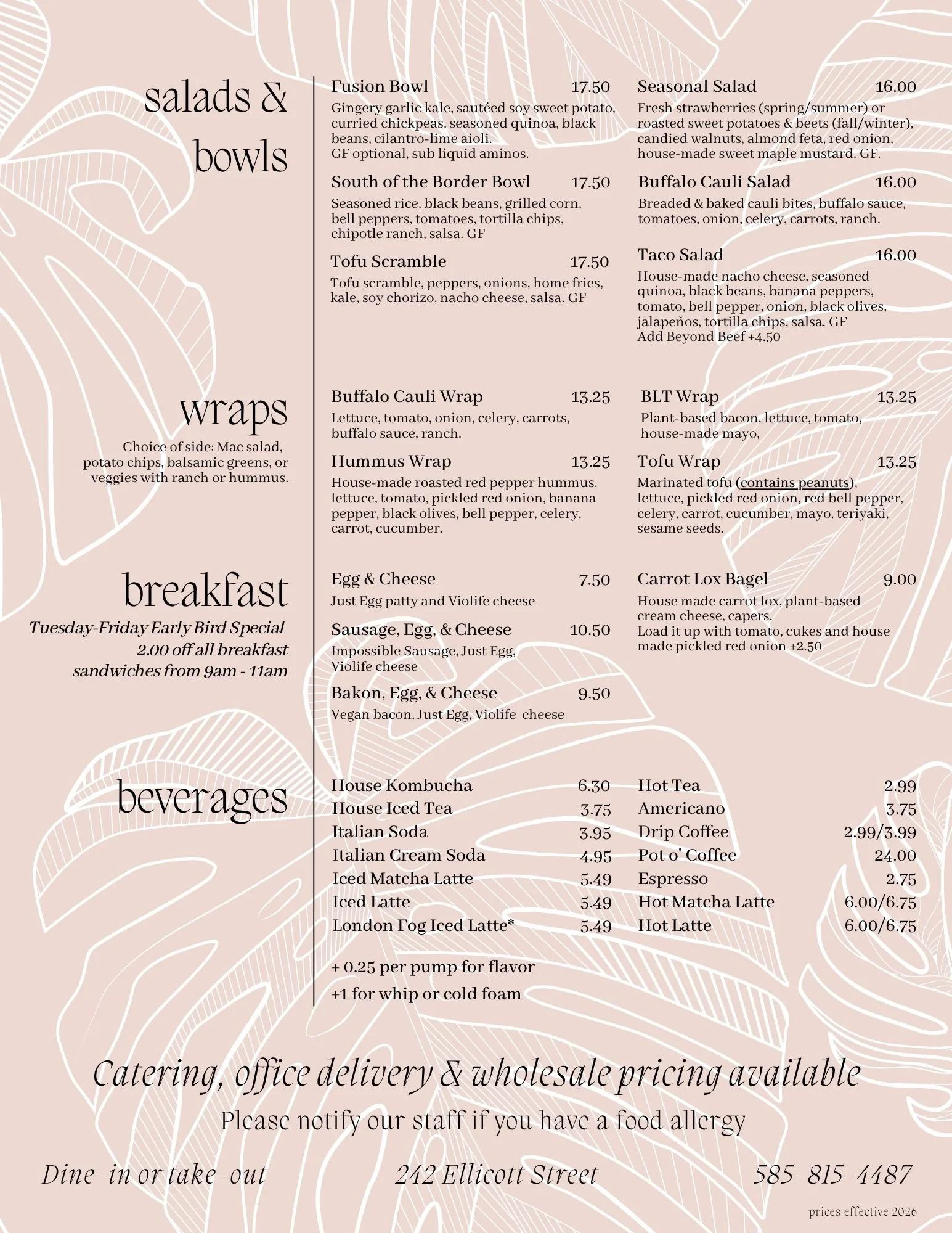 Greens, strawberries (spring/summer) or Roasted Sweet Potatoes & Beets (fall/winter), candied walnuts, almond feta, red onion, sweet maple mustard.